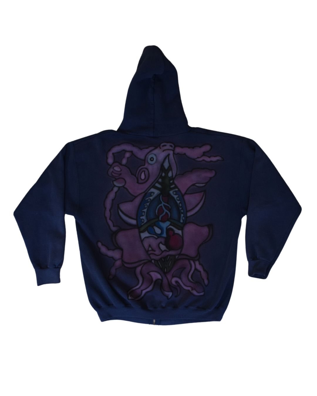 Airbrush on a vintage navy blue zip up sweater. Fits like a large.