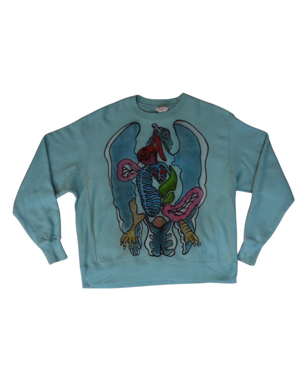 Airbrush on a vintage light blue, heavyweight sweater. Champion Reverse Weave. Fits like a XL.