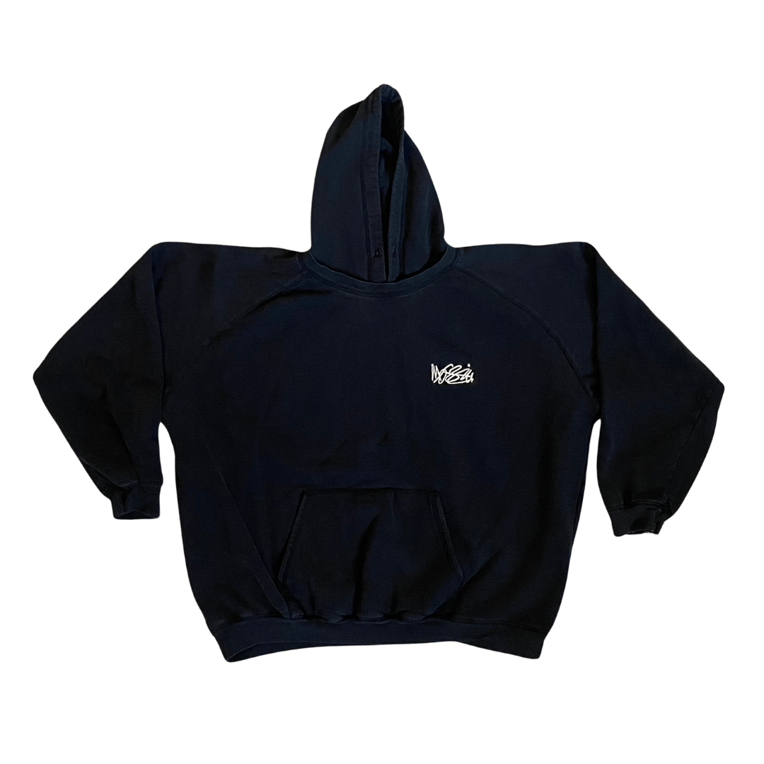 Airbrush and bleach on a vintage Mossimo black hoodie. Tagged a "men's" medium fits like an L/XL.