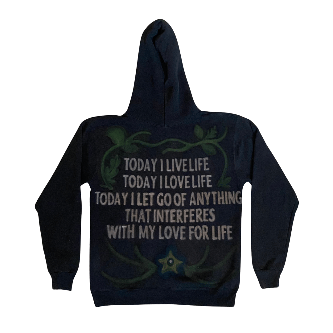 Airbrush and bleach on a black Russell hoodie. Tagged a "men's" medium fits like an small/medium.